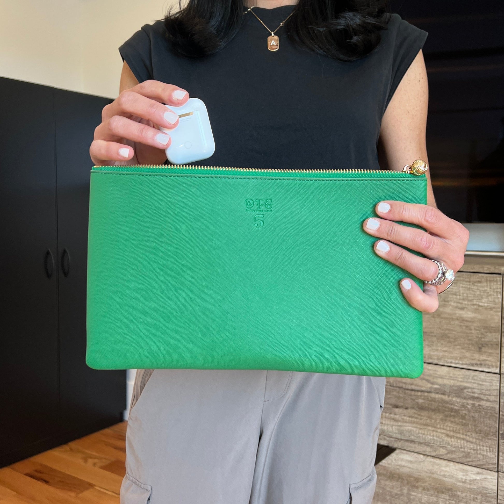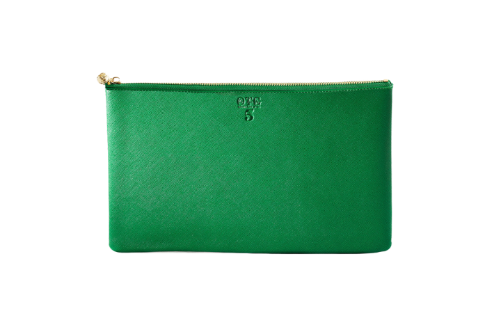 Size #5 Green is the perfect versatile accessory for keeping your essentials easy to access while making a chic fashion statement. This spacious pouch seamlessly transitions from organization to style.
