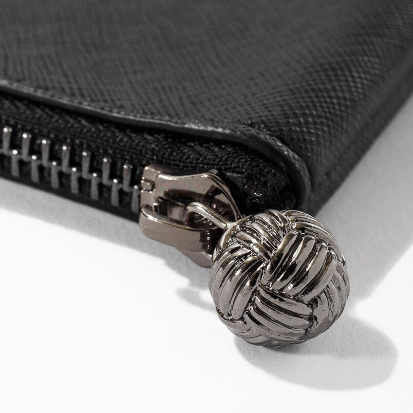 - Custom brass zipper with signature knot pull