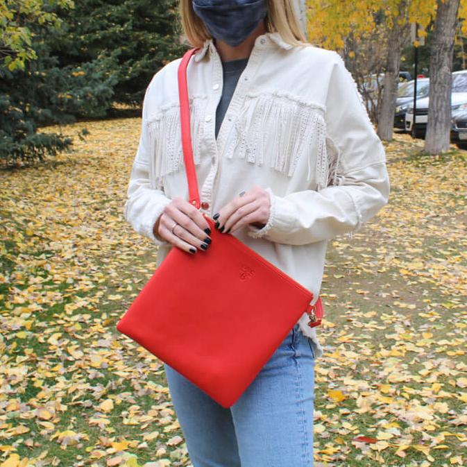 Size #6 Orange is the perfect versatile bag that transitions from tote organizer to crossbody in seconds. This chic and practical bag comes with a 48" removable crossbody strap, allowing you to grab it from your tote, add the strap, and wear crossbody style to suit your needs.